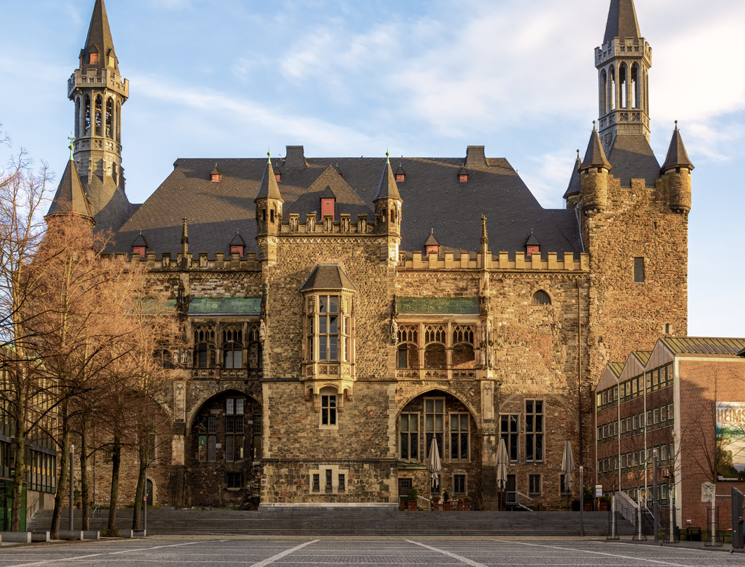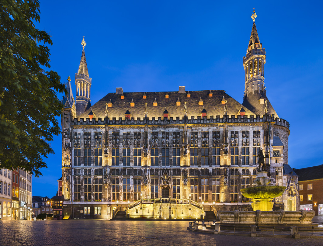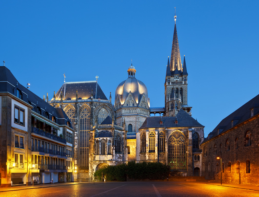 Trasferimento ad Aquisgrana, Aachen in tedesco e Aix-la-Chapelle in francese, fu la capitale della Rinascita Carolingia del IX secolo, grazie agli studi della Schola Palatina e grazie agli artisti e artigiani che vi confluirono da tutto l'Impero. Carlo Magno vi fece la sua residenza preferita e vi morì nell'814, dopo averla impreziosita con il maestoso Palazzo Imperiale e la costruzione della Cappella Palatina. La Cattedrale è la più antica del Nord-Europa. Spostandoci nel Centro Storico, ammireremo l'antico Municipio in stile gotico e le duecentesche case private.